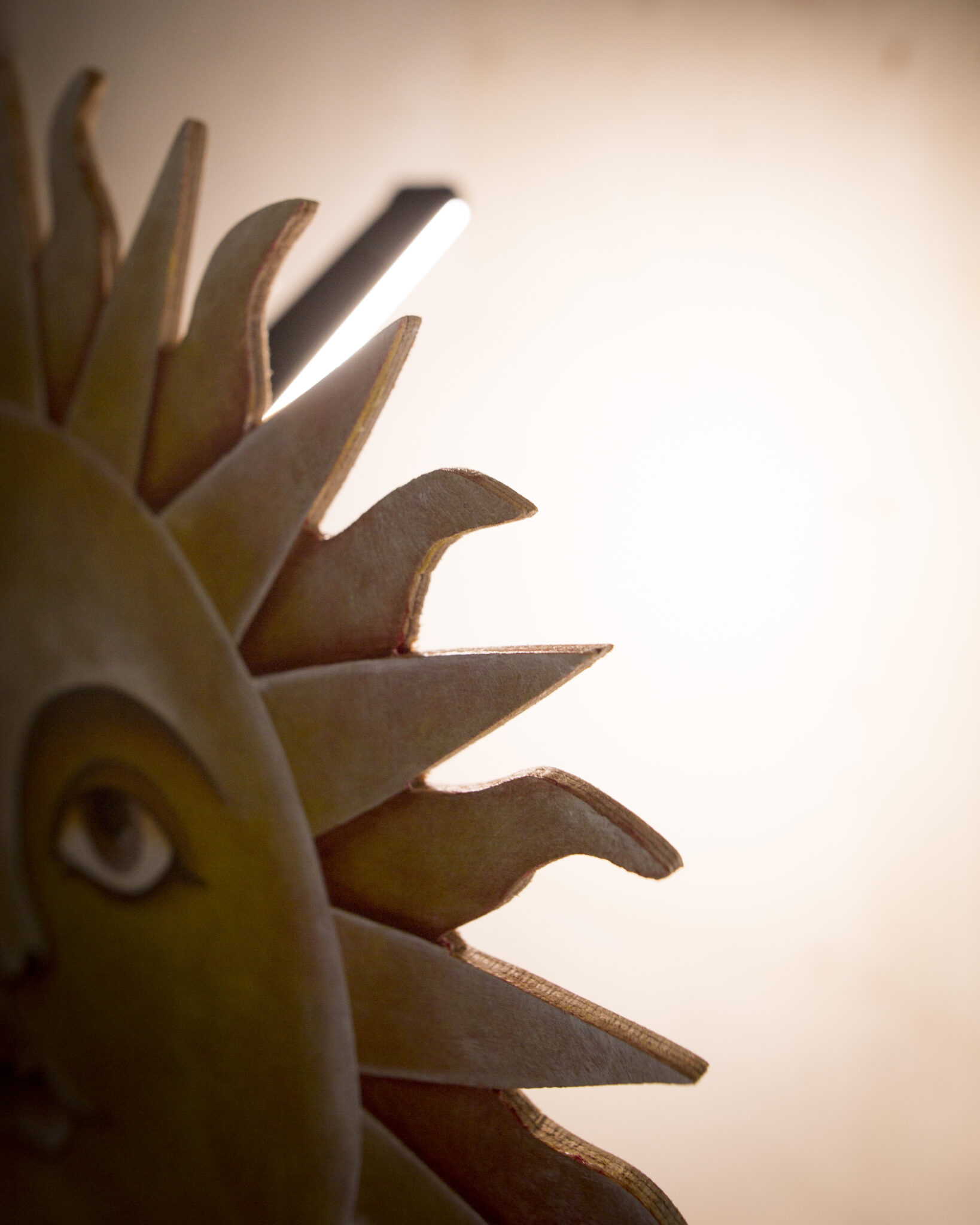 Sì, perchè in effetti la vera protagonista di quest’opera è la parte sospesa, quella che al posto di un ordinario paralume, nasconde la fredda tecnicità delle 120 perle di LED che si trovano lì dietro. In legno traforato e dipinto, un pacioccone sole nei toni del rosso e del giallo, ci invita a godere la vita insieme a lui.