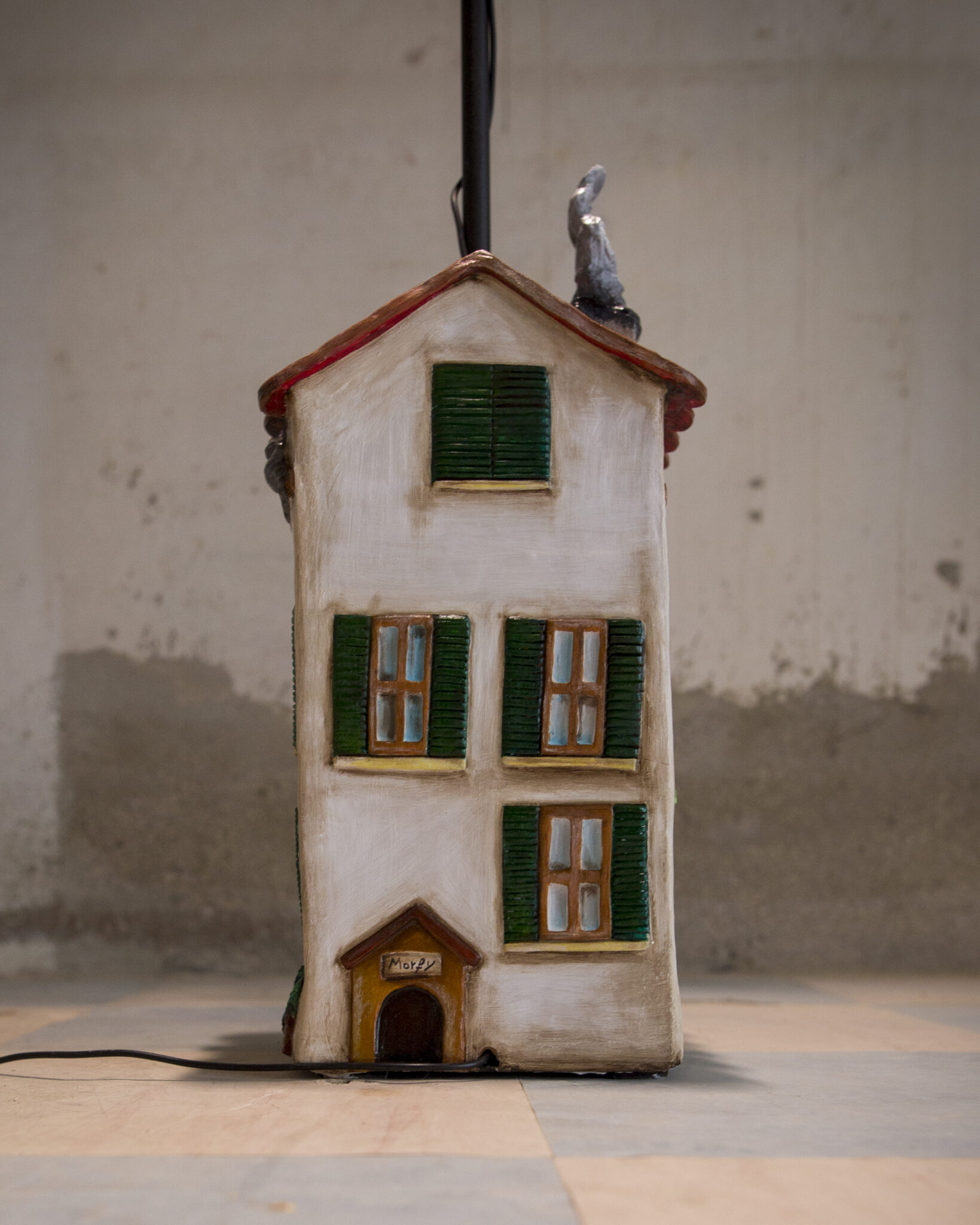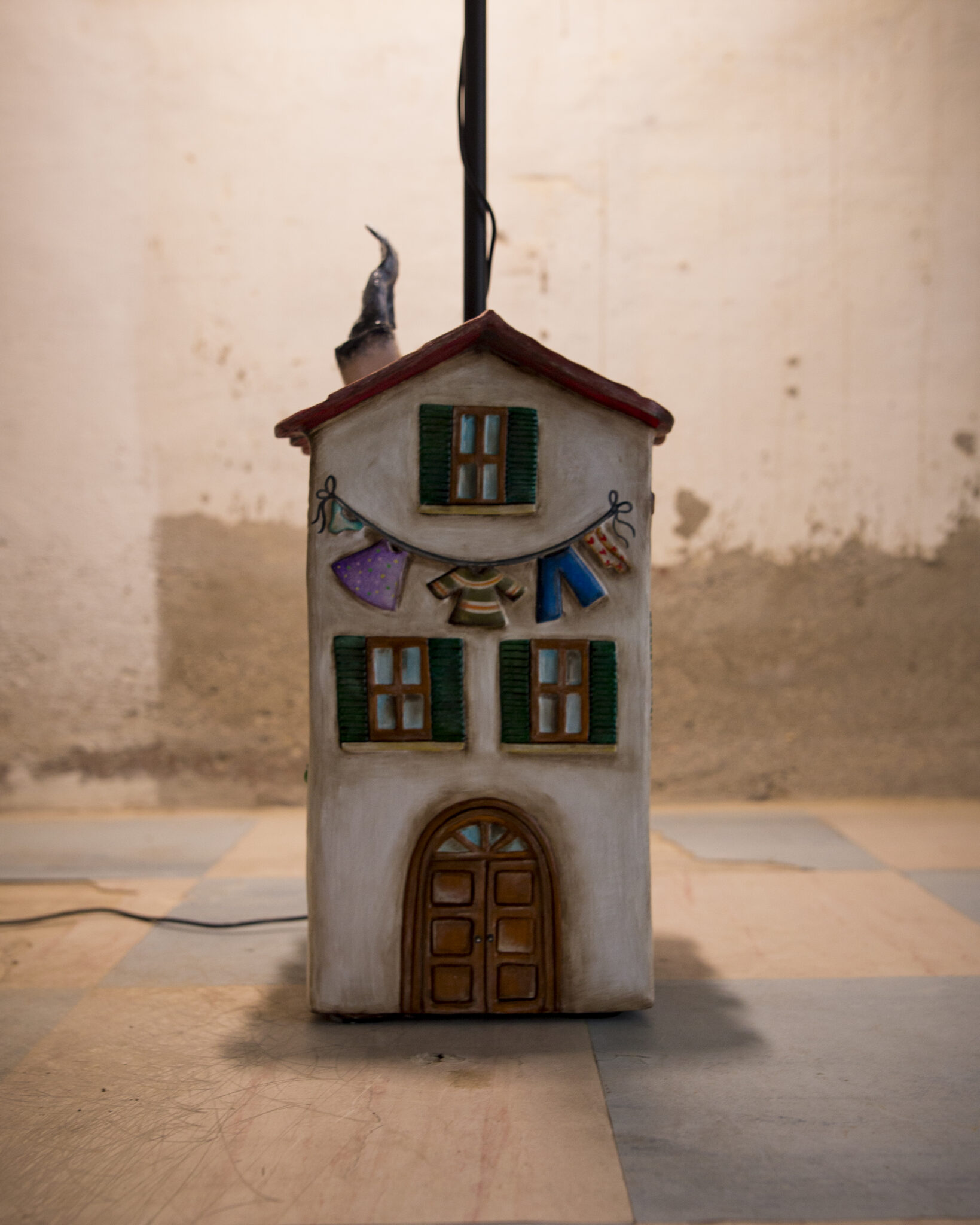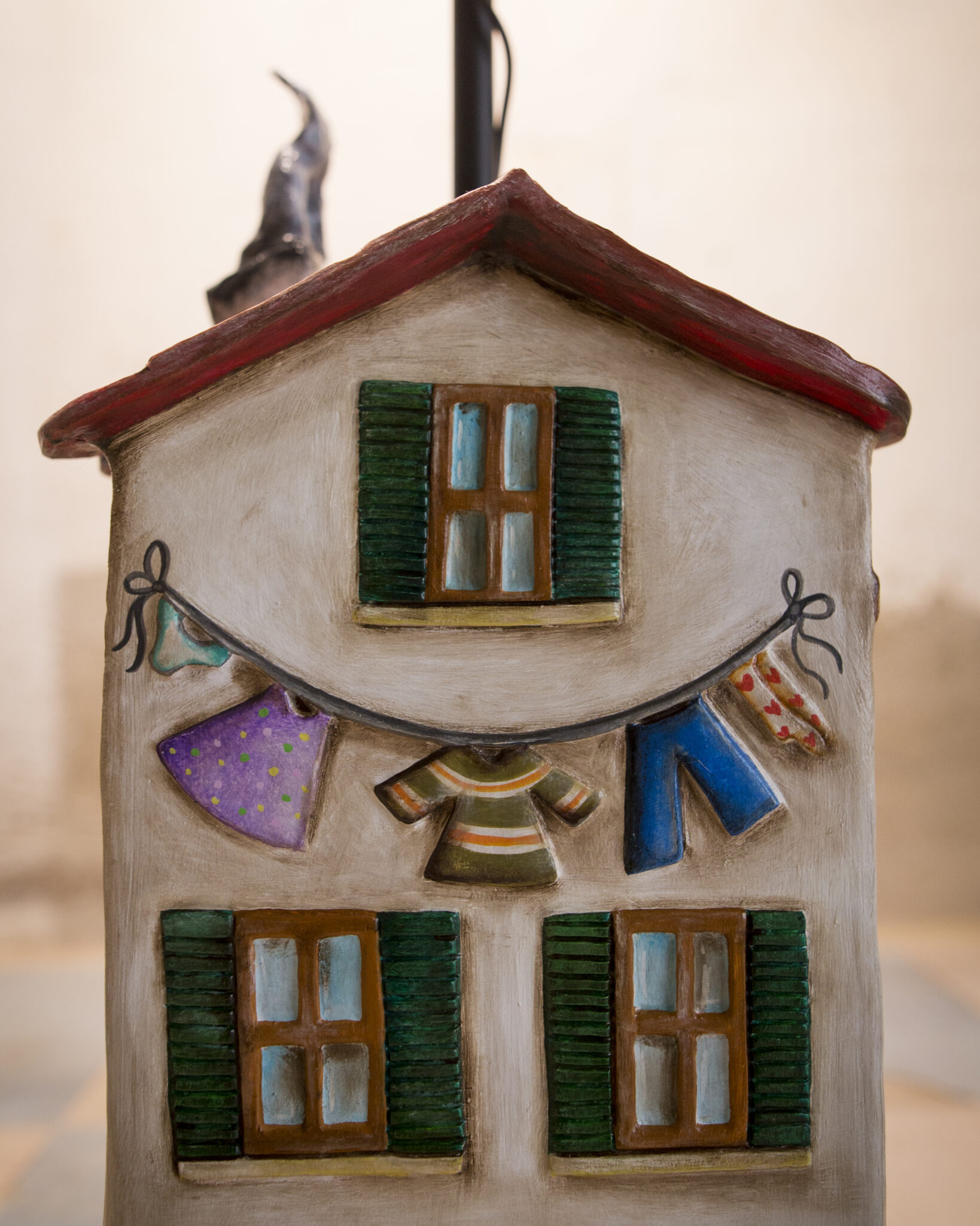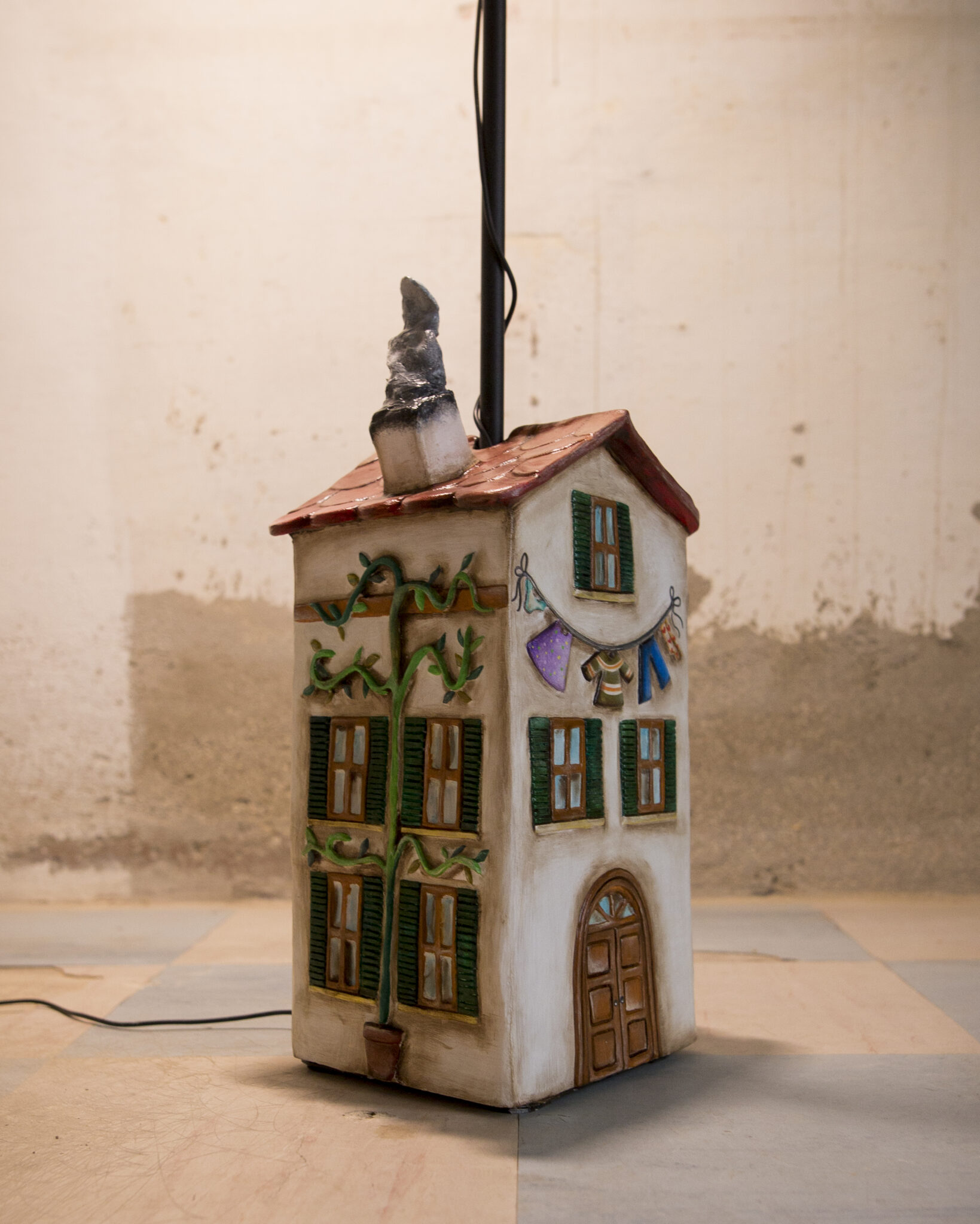 In terracotta dipinta a freddo, il basamento è più che una casa, un vero e proprio palazzo su più piani. Ha un importante portone d’ingresso, tanta natura intorno, il gatto appollaiato sul cornicione e l’immancabile cuccia per il cane con nella targhetta scritto Morfy, il diminutivo di Morfina, il nome del pastore maremmano di proprietà dell’artista che l’ha realizzata. Un dettaglio per nulla trascurabile è quello dei panni stesi, una tipicità che ci viene riconosciuta in tutto il mondo. La suggestione che ci offre è quella del profumo del bucato che si asciuga al calore di un generoso sole.