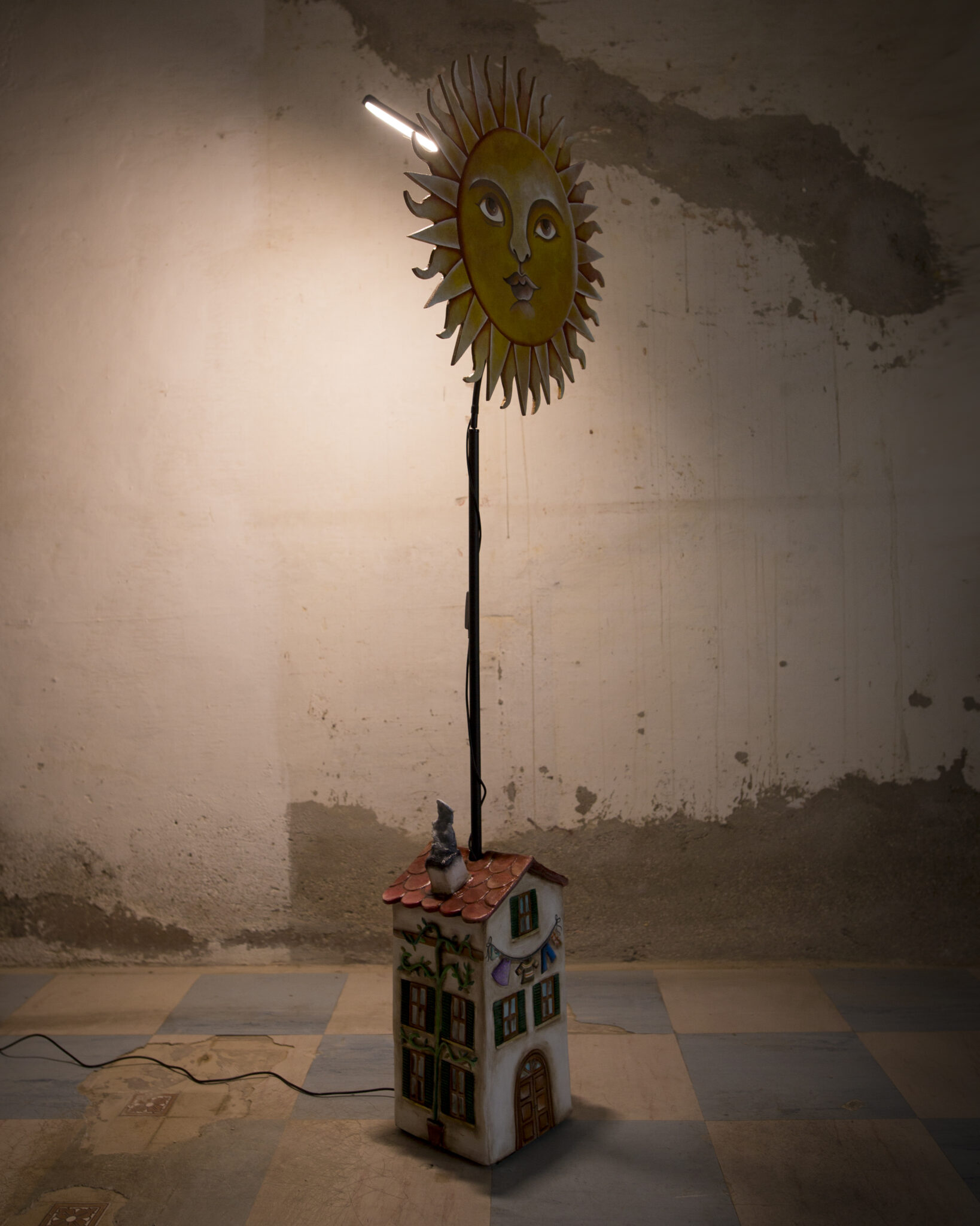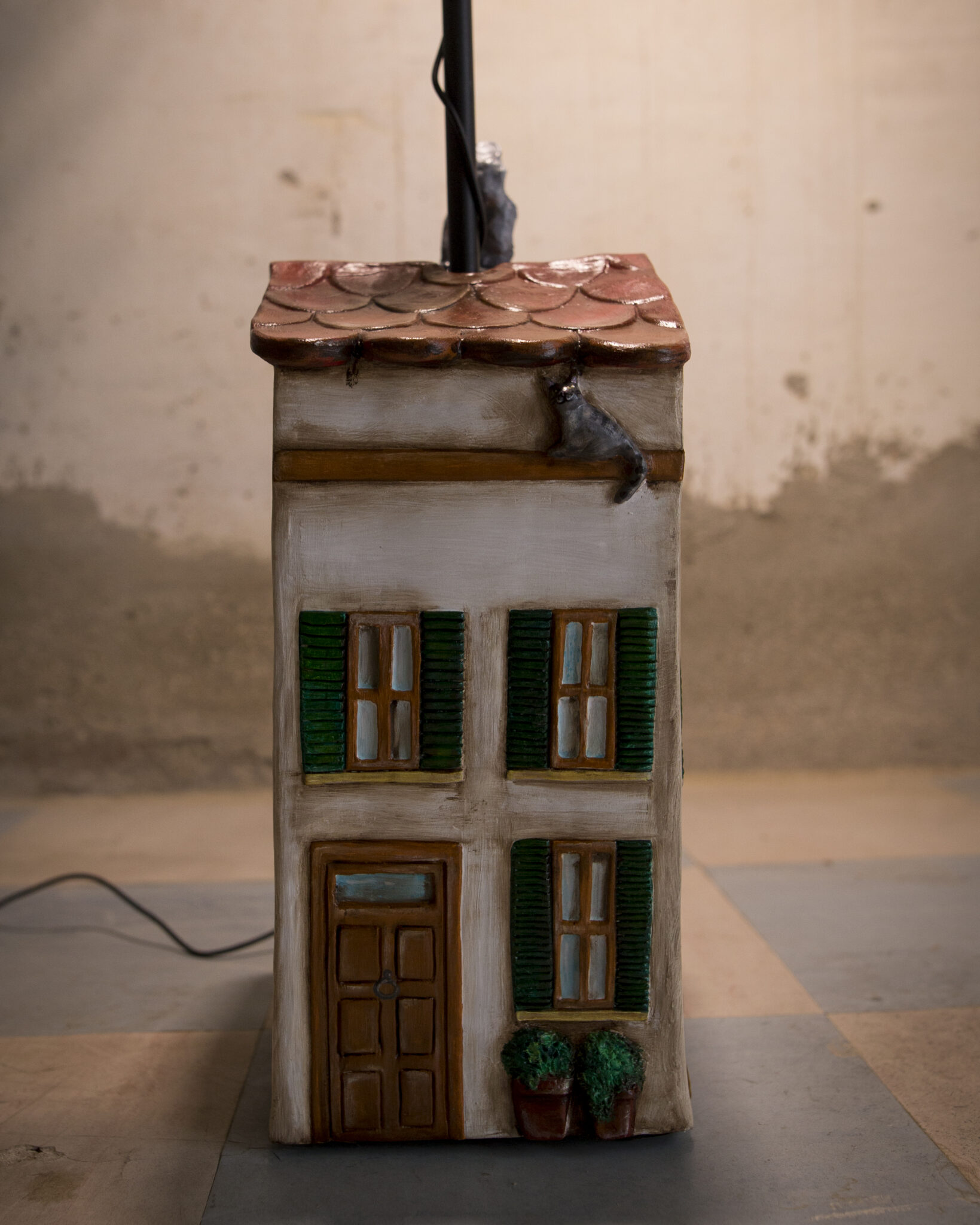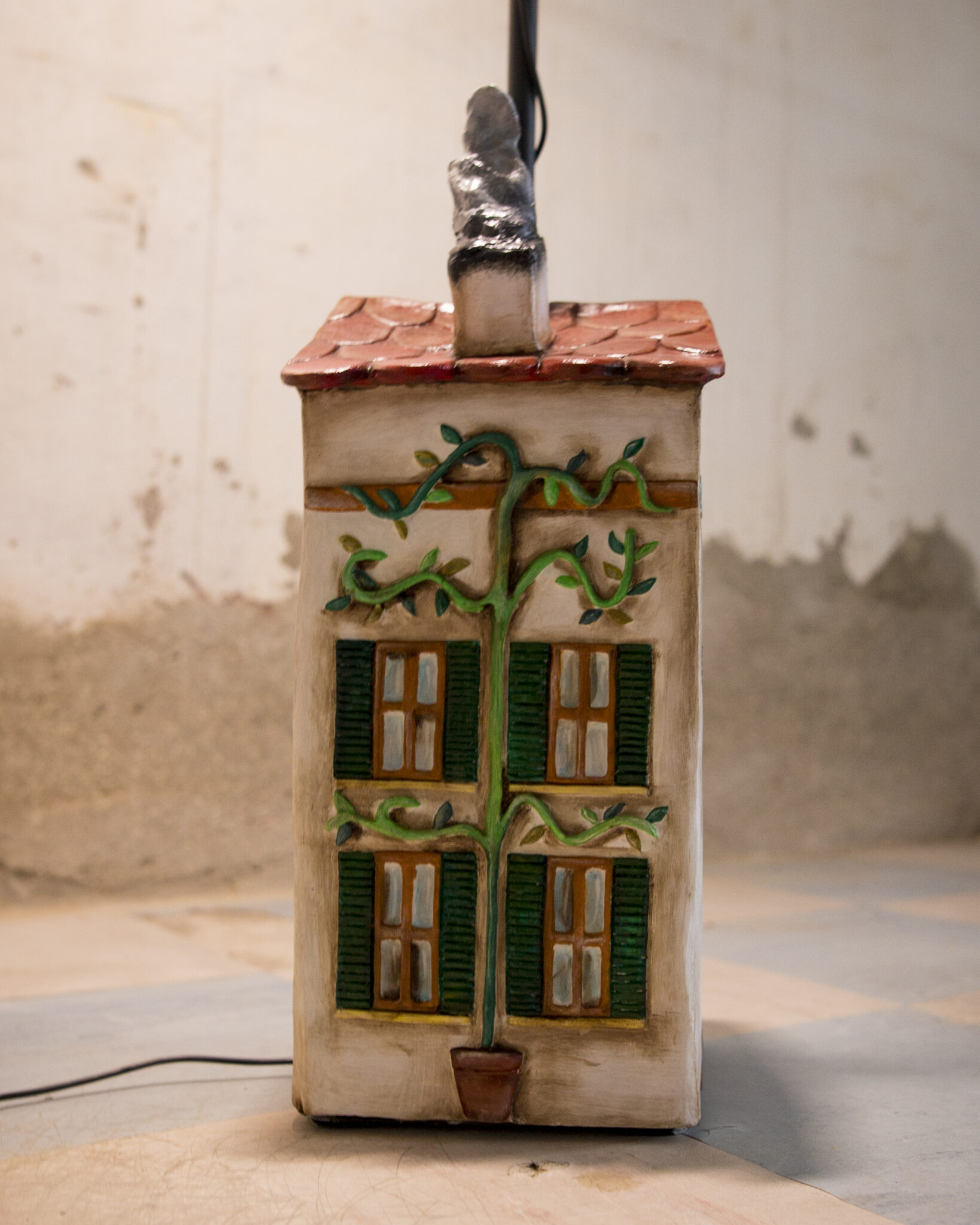 In terracotta dipinta a freddo, il basamento è più che una casa, un vero e proprio palazzo su più piani. Ha un importante portone d’ingresso, tanta natura intorno, il gatto appollaiato sul cornicione e l’immancabile cuccia per il cane con nella targhetta scritto Morfy, il diminutivo di Morfina, il nome del pastore maremmano di proprietà dell’artista che l’ha realizzata. Un dettaglio per nulla trascurabile è quello dei panni stesi, una tipicità che ci viene riconosciuta in tutto il mondo. La suggestione che ci offre è quella del profumo del bucato che si asciuga al calore di un generoso sole.