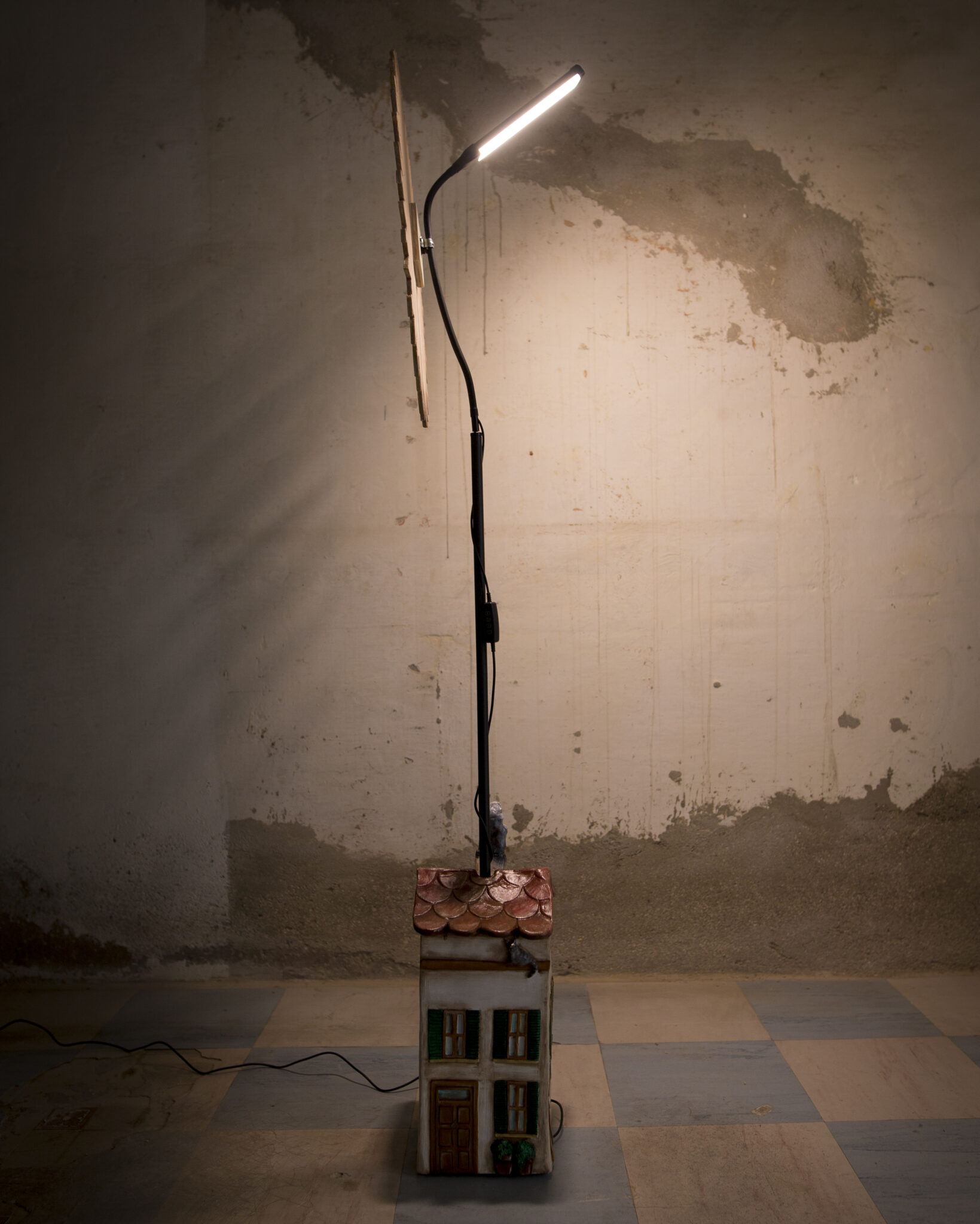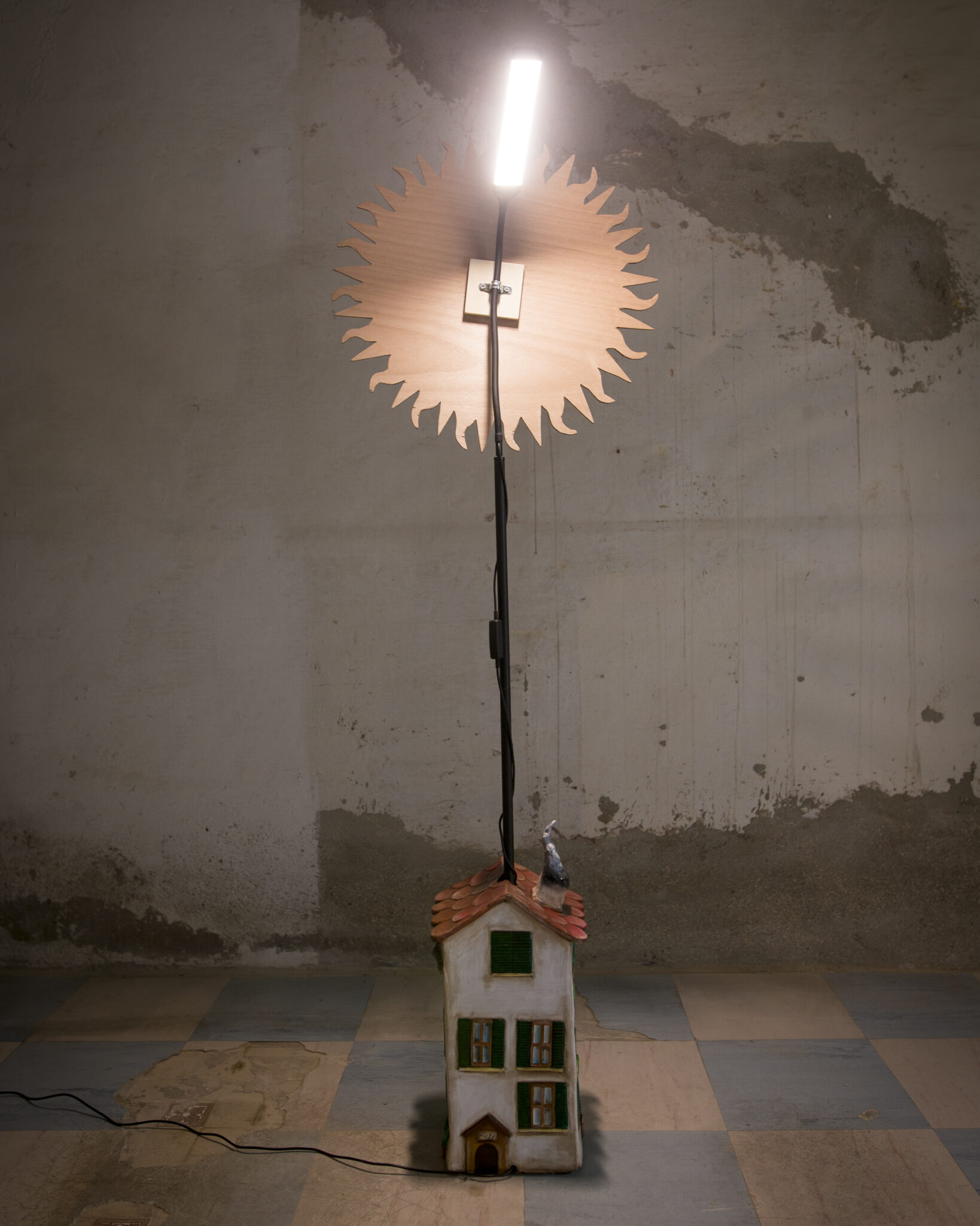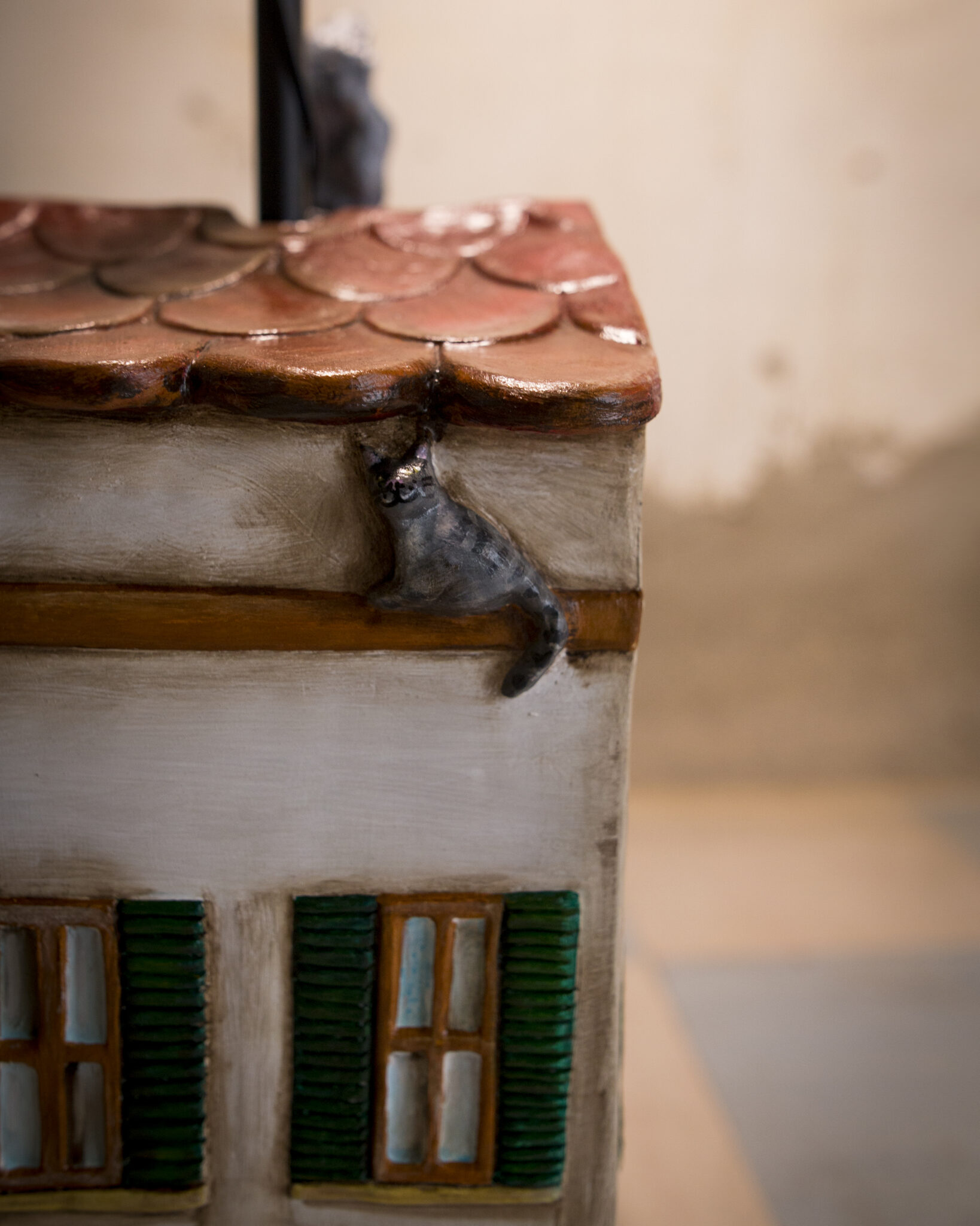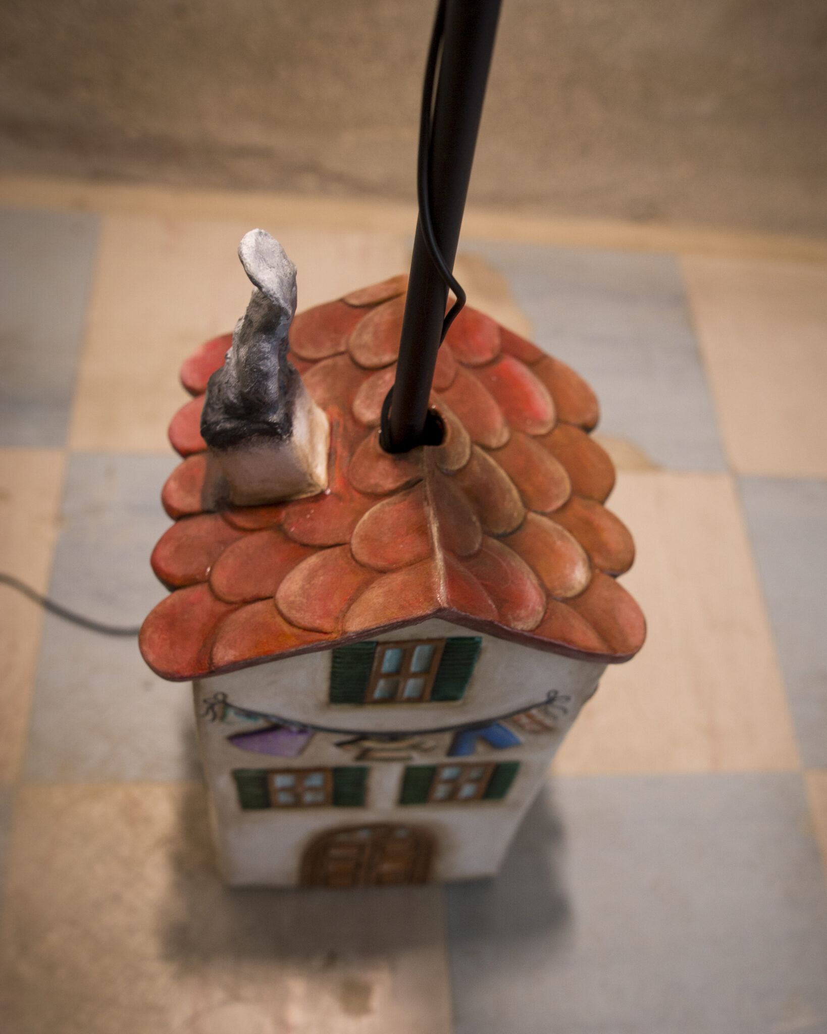 In terracotta dipinta a freddo, il basamento è più che una casa, un vero e proprio palazzo su più piani. Ha un importante portone d’ingresso, tanta natura intorno, il gatto appollaiato sul cornicione e l’immancabile cuccia per il cane con nella targhetta scritto Morfy, il diminutivo di Morfina, il nome del pastore maremmano di proprietà dell’artista che l’ha realizzata. Un dettaglio per nulla trascurabile è quello dei panni stesi, una tipicità che ci viene riconosciuta in tutto il mondo. La suggestione che ci offre è quella del profumo del bucato che si asciuga al calore di un generoso sole.