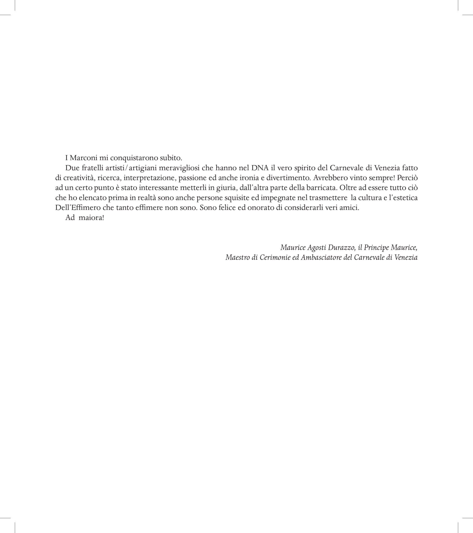 Il libro contiene 56 scatti d’autore accompagnati da aneddoti inediti dei fratelli Marconi, legati al Carnevale di Venezia.