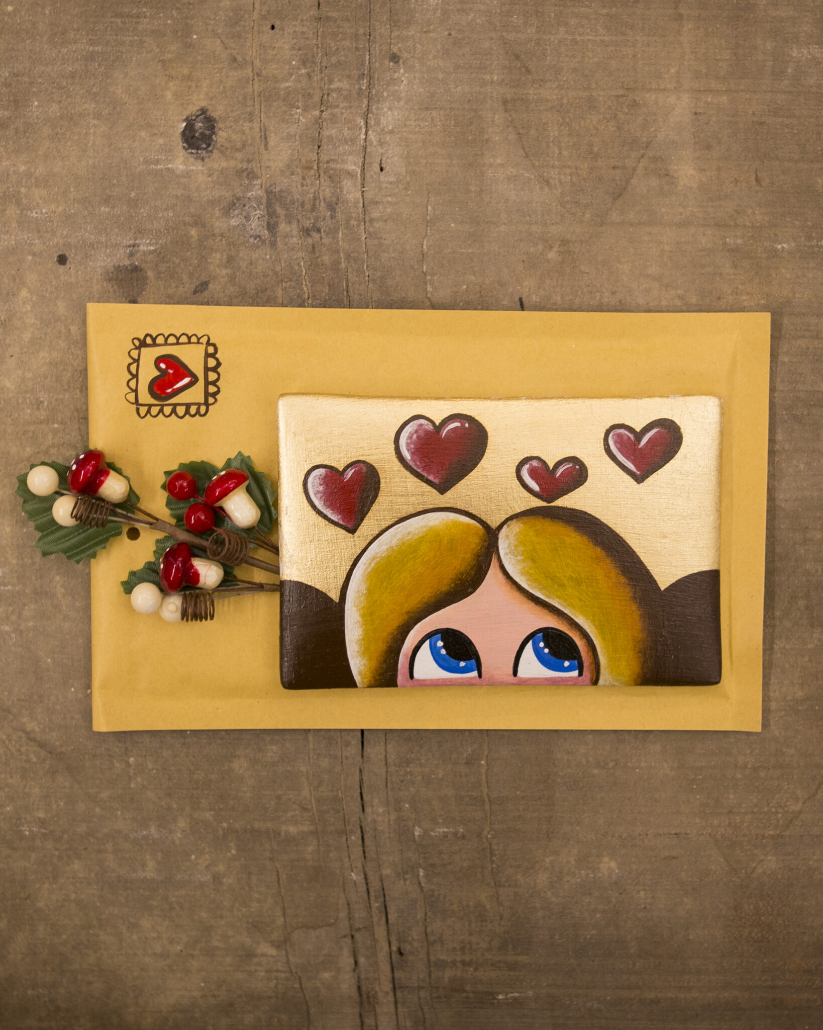 Sul retro c’è dipinta la tradizionale griglia per scrivere con l’indelebile l’indirizzo e la dedica di chi lo regala. Anche il francobollo è un’illusione: un rosso cuoricino è infatti incorniciato da un quadratino dentellato.