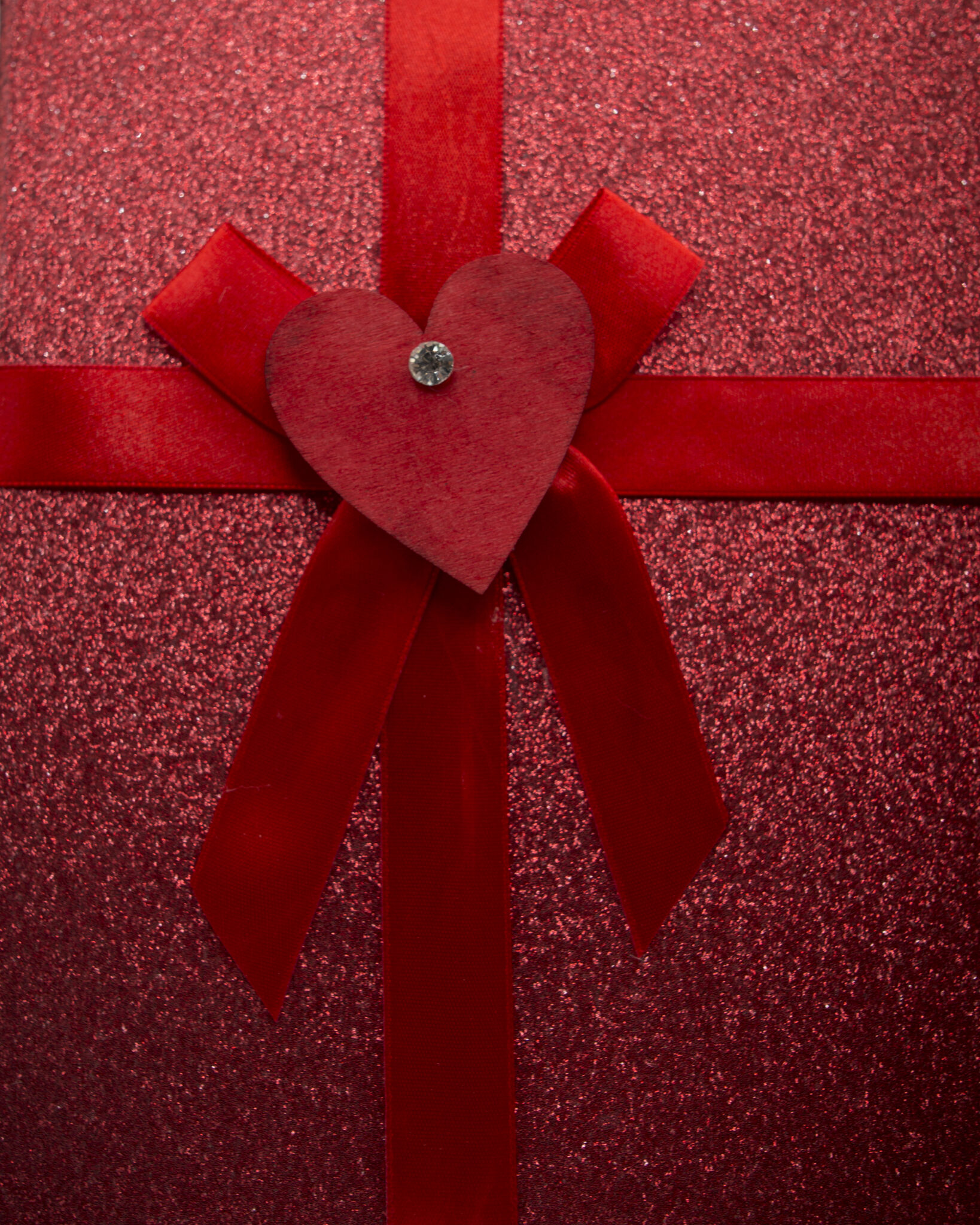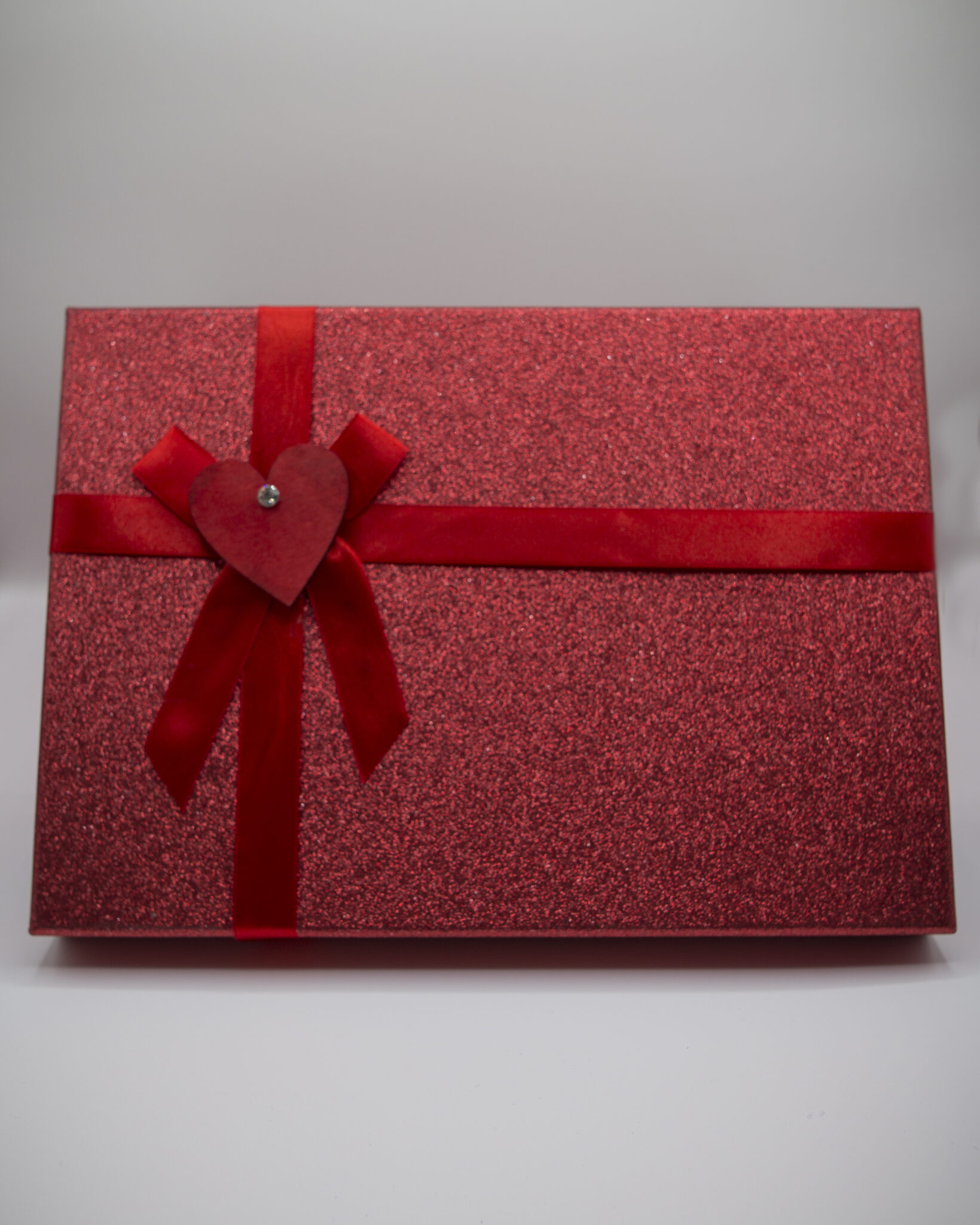 Per celebrare l’amore di una coppia, una scatola glitterata rossa con un grosso cuore di legno e strass sopra (Base: 28×20 cm Altezza: 12 cm).