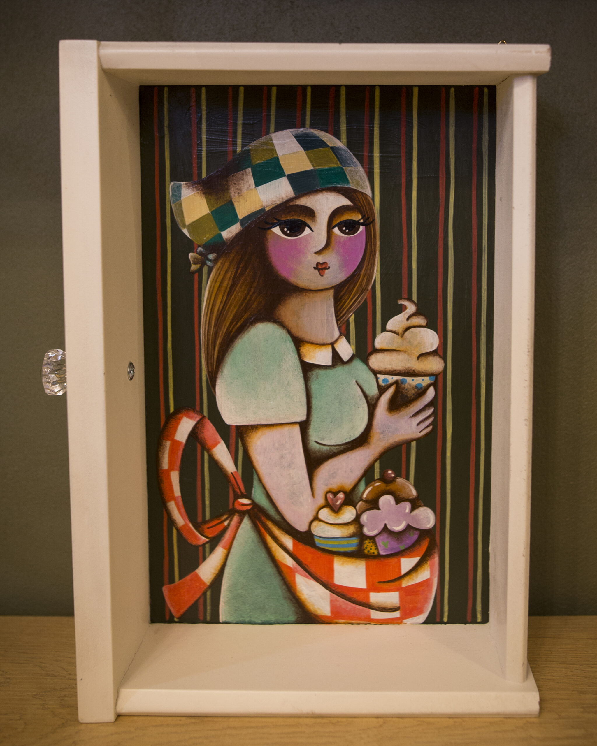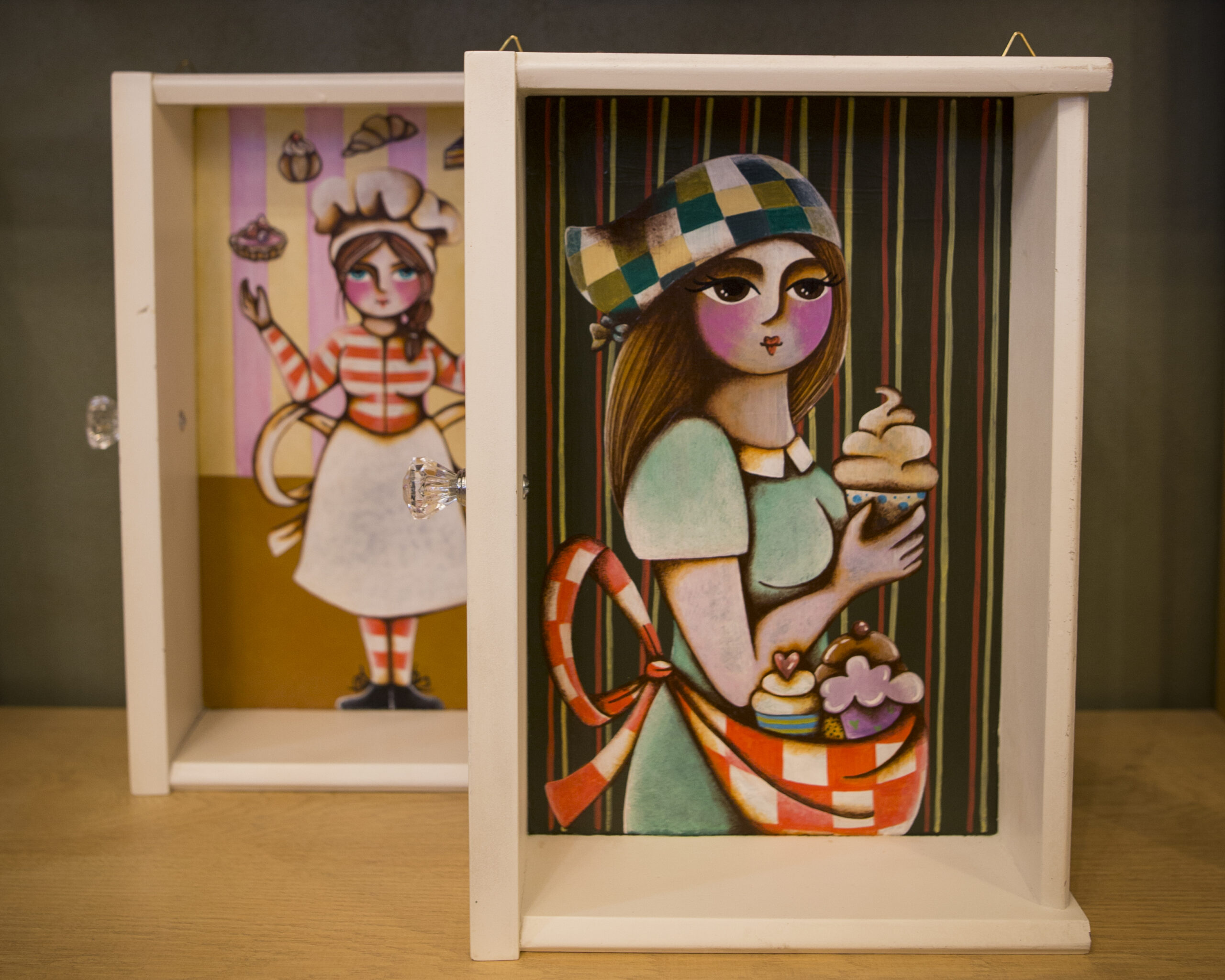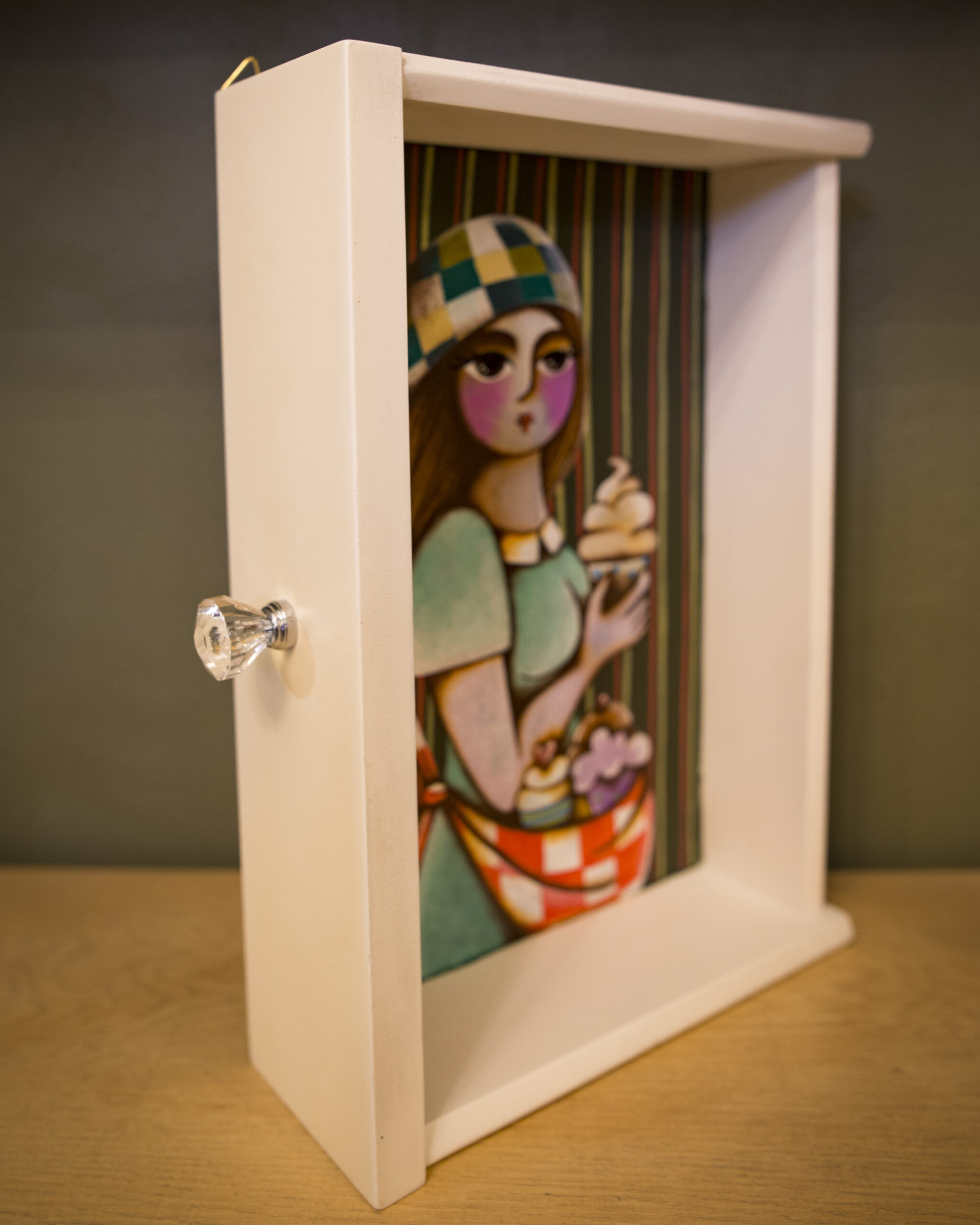 Queste opere possono essere appese al muro come piccole teche artistiche, oppure esposte su mensola o mobile come complementi d’arredo dal sapore vintage e fiabesco. Perfette per chi ama il design artigianale e le storie che profumano di zucchero e creatività.