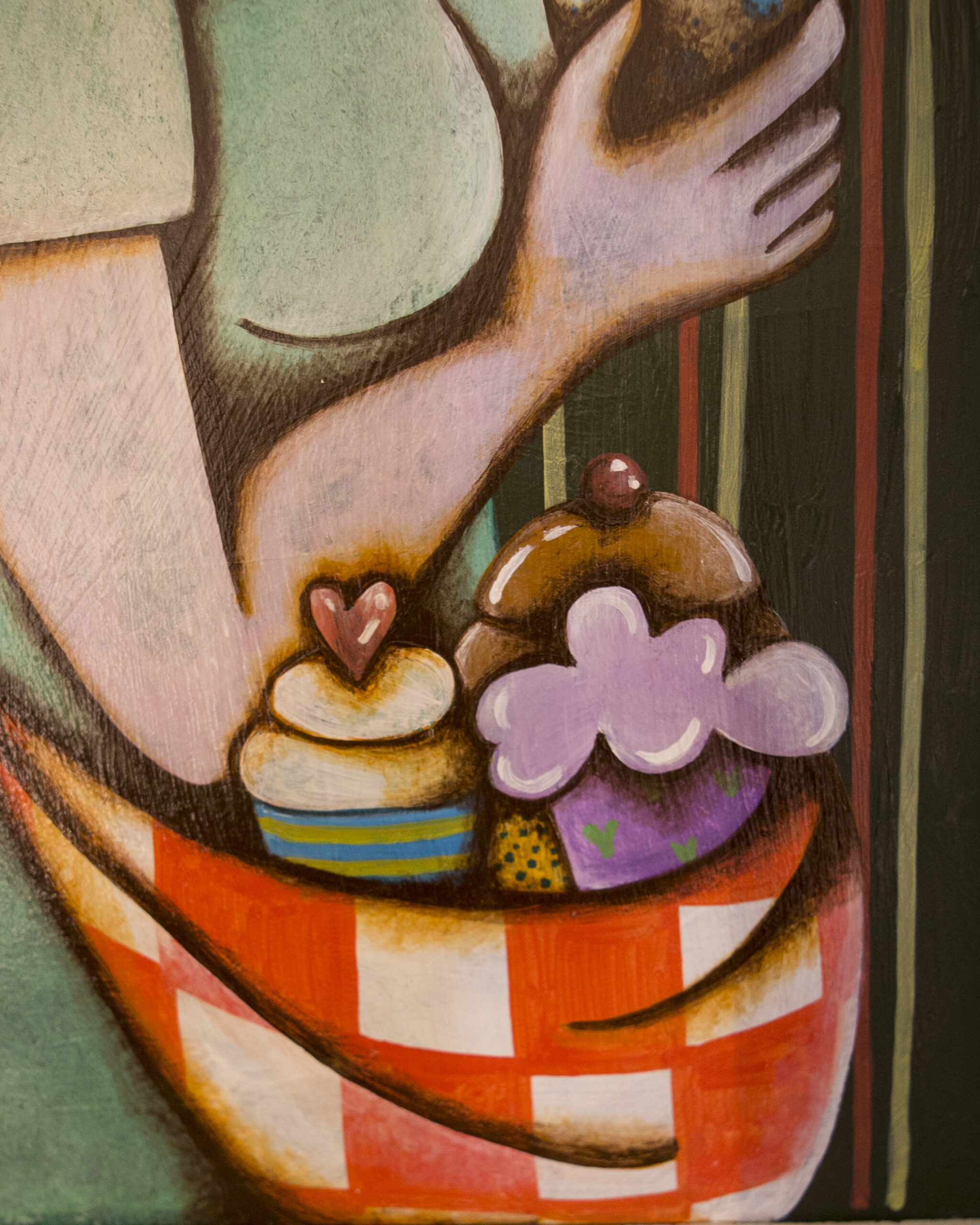 All’interno,  due donne dai grandi occhi, immerse in un mondo dolce e colorato — tra torte, cupcake e profumi di pasticceria — ispirate allo stile sognante e narrativo di Marconilandia.