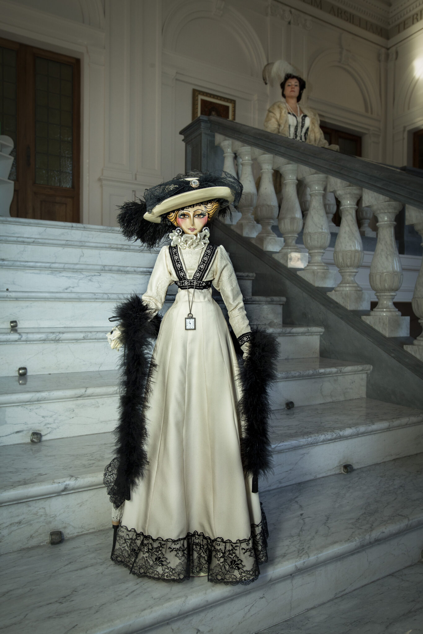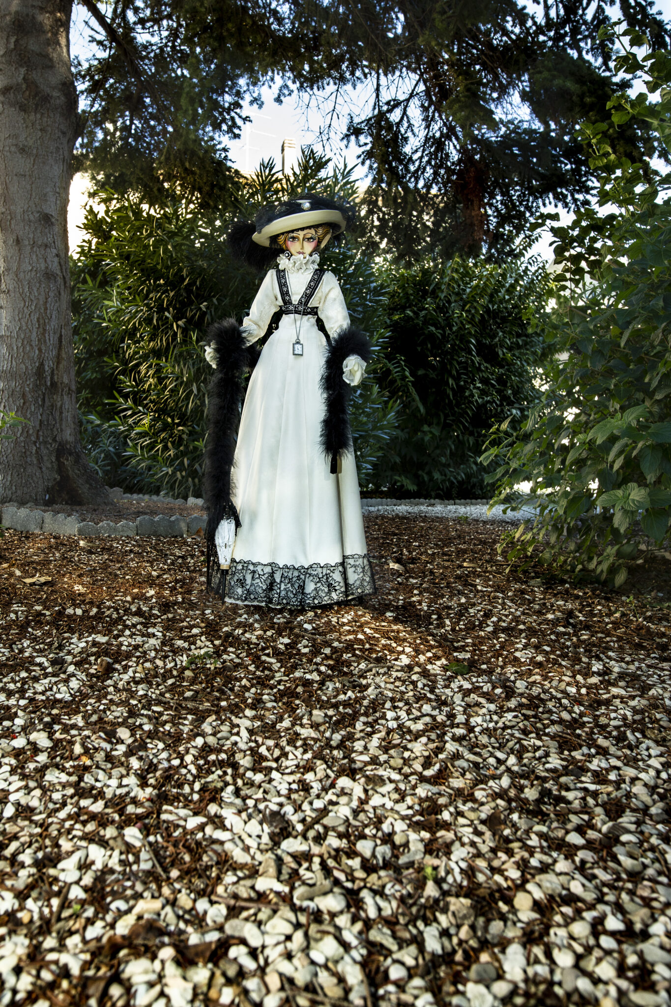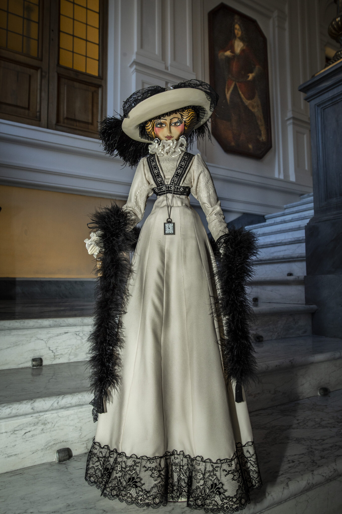 Bambola in legno di tiglio interamente scolpita a mano. Impreziosita dastola in marabù, orologio in miniatura funzionante, ombrellino parasole in pizzo. La piuma del cappello è vintage e risale ai primi del ‘900.