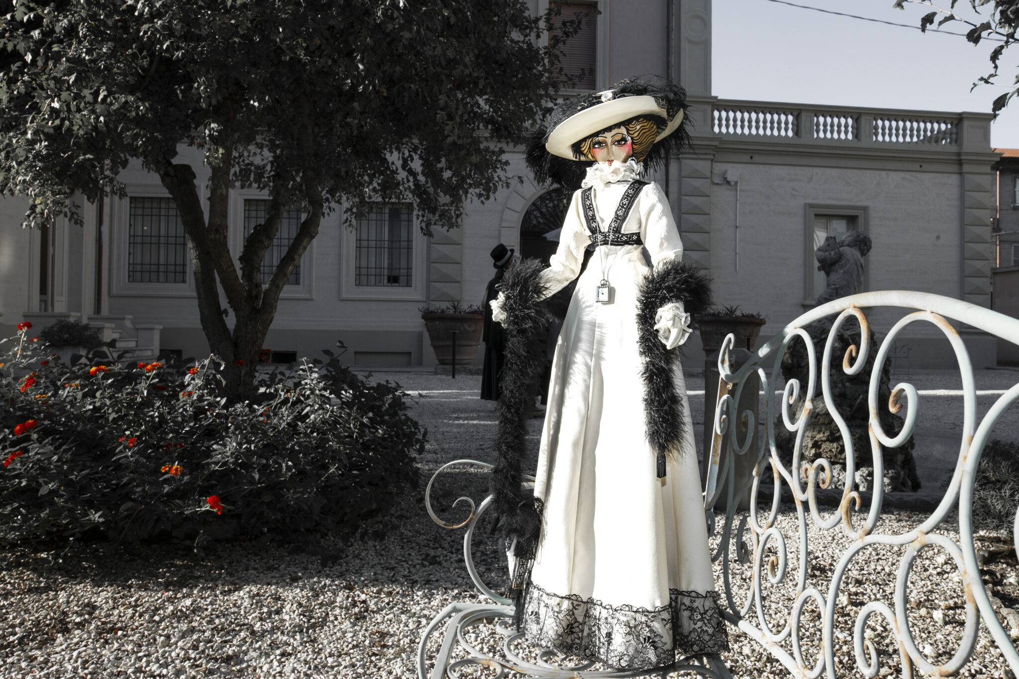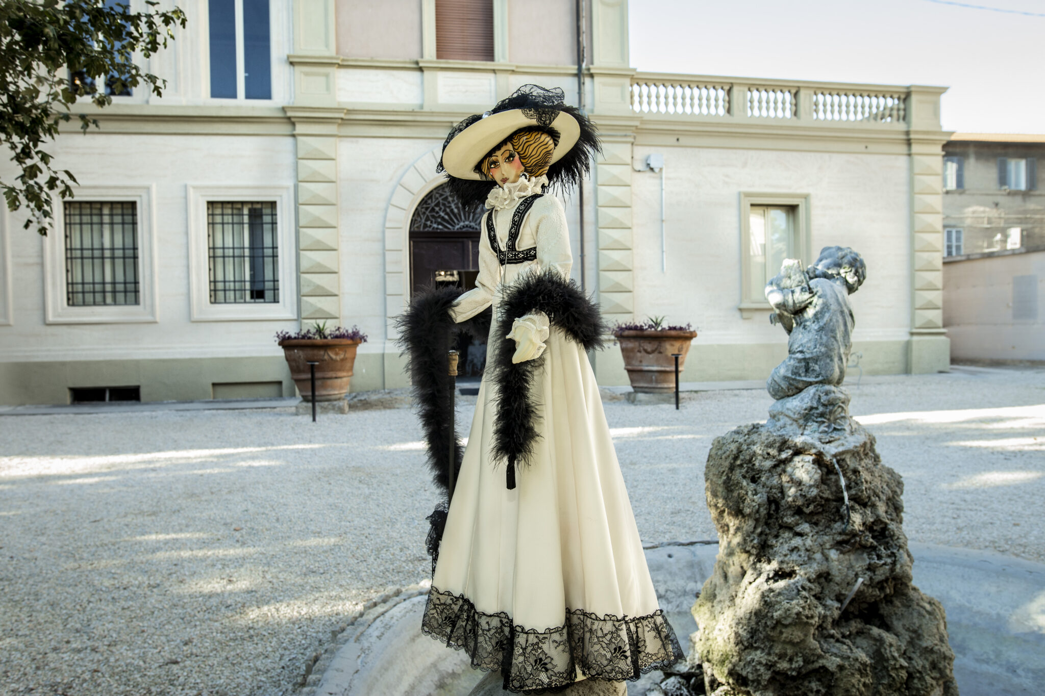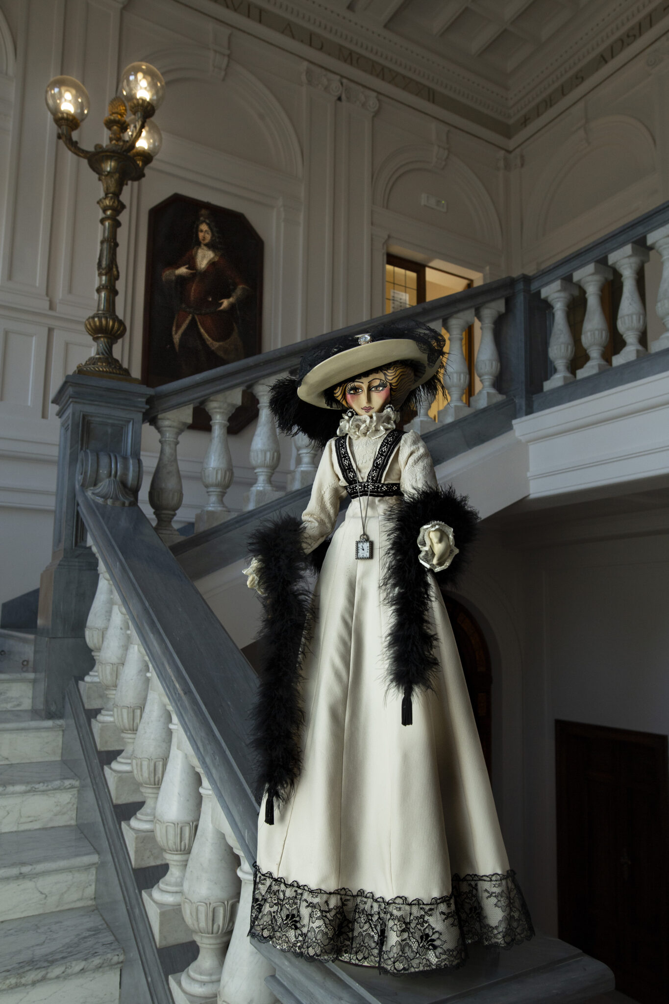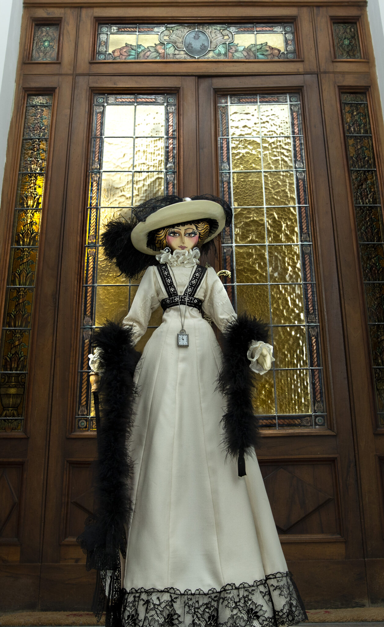 Bambola in legno di tiglio interamente scolpita a mano. Impreziosita dastola in marabù, orologio in miniatura funzionante, ombrellino parasole in pizzo. La piuma del cappello è vintage e risale ai primi del ‘900.