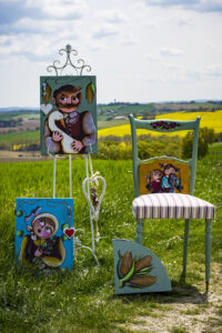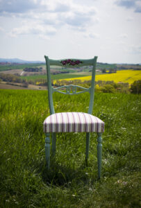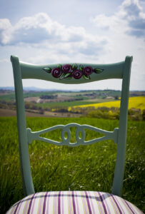 Una vecchia sedia anni ’50 è stata colorata di verde salvia e decorata nello schienale, con le stesse rose che tiene in mano la Pupa. Per il tessuto della seduta è stato scelto un allegro motivo a righe nei toni del verde, rosso bordeaux e beige.