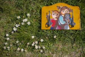 La famiglia non sarebbe però completa senza la presenza dei bambini nuovamente dipinti sull’appendino in legno dietro la porta. Lei più grandicella, ha due grandi fiocchi bianchi che raccolgono i suoi capelli in due ciuccetti laterali. Con sè tra le braccia un tenero gatto grigio. Il bimbo intanto gioca con un soffione.