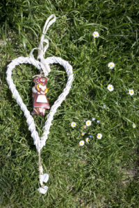 Sulla parete arrotondata, troneggia il cuore in legni intrecciati con al centro la stessa coppia, questa volta fatta in tessuto imbottito.