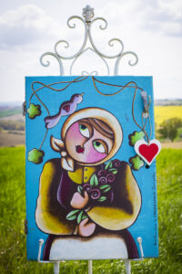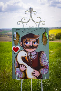 Due quadri dipinti su vecchi sportelli di mobili, accoglieranno anche in questo caso gli ospiti dell’albergo. La donna coperta in testa da un grande fazzolettone, stringe al petto un mazzo di rose e rivolge lo sguardo ad un uccellino appena posatosi sul suo capo, del tutto ignara che il contadino del quadro a fianco, la sta intanto guardando con occhi languidi mentre abbraccia con un’oca bianca dal lungo collo. Attorno a lui per completare l’opera, due pannocchie di mais che ritroviamo anche nella mensolina ad angolo del divano.