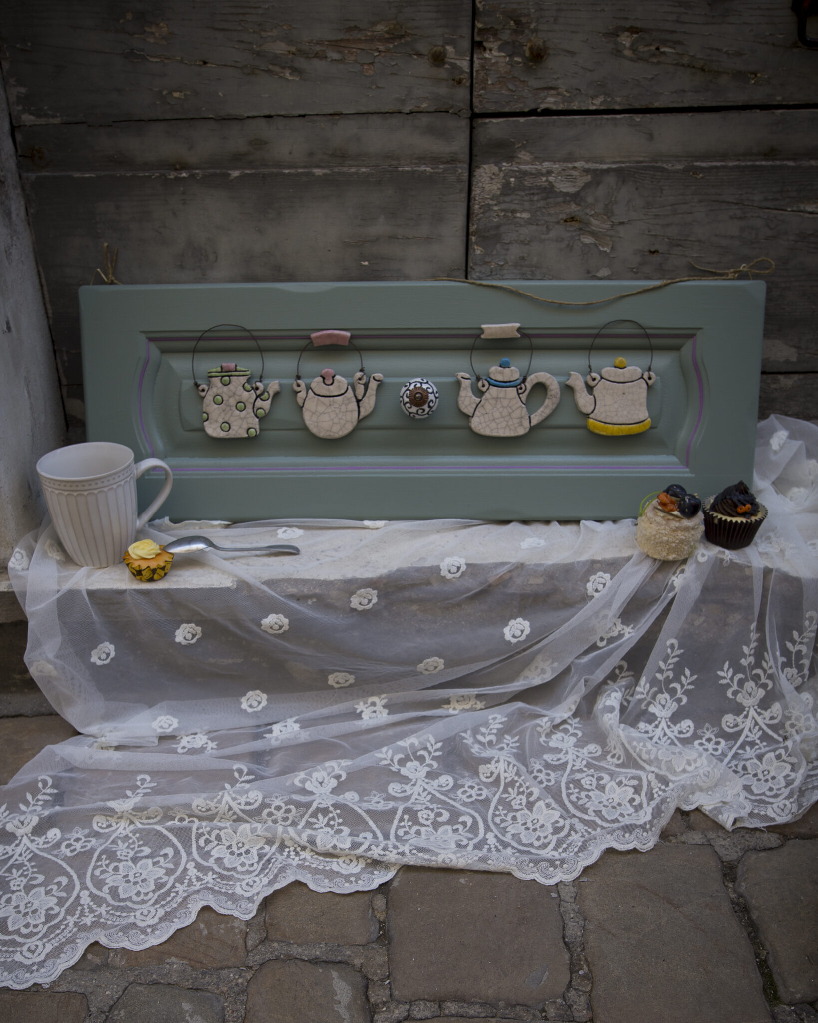 Momento del tè – Quadro in ceramica raku e legno di recupero con ganci