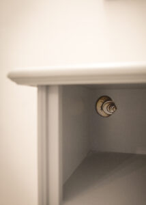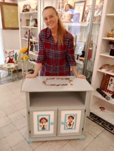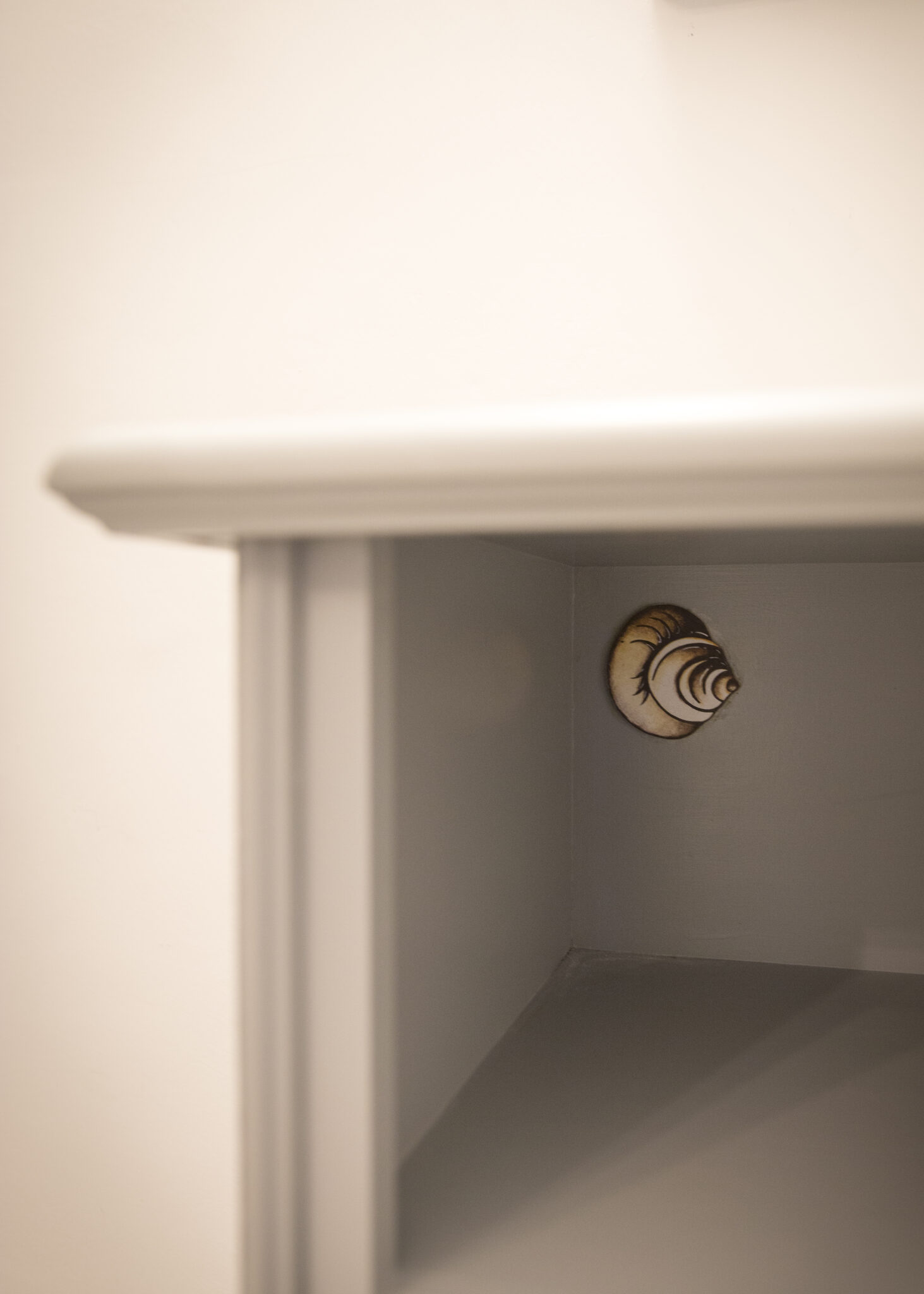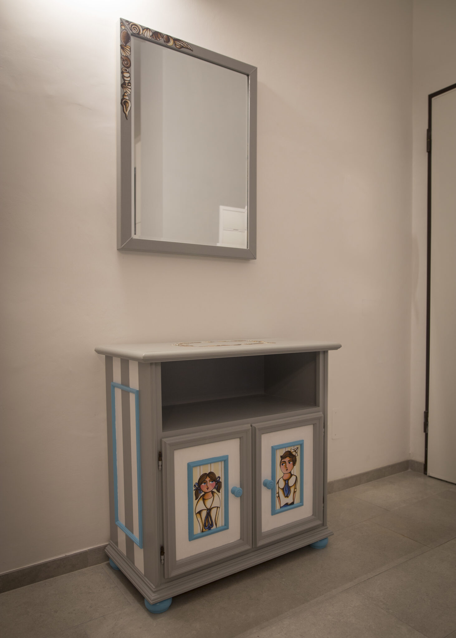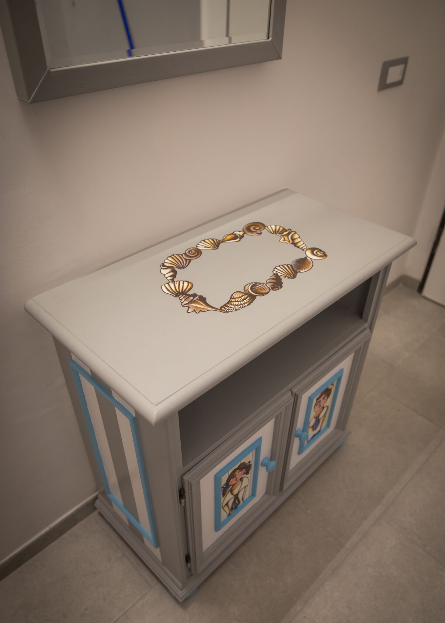 Nelle ante davanti abbiamo raffigurato due marineretti, un maschietto e una femminuccia che si scambiano sguardi furtivi. Nel ripiano sopra, una ghirlanda di conchiglie al centro e un altro guscio nascosto nel vano sotto, per coprire il buco realizzato per far passare i fili degli elettromestici. Abbinato poi, uno specchio rettangolare in legno, sempre colorato di grigio e impreziosito con conchiglie di richiamo a quelle della consolle sottostante.