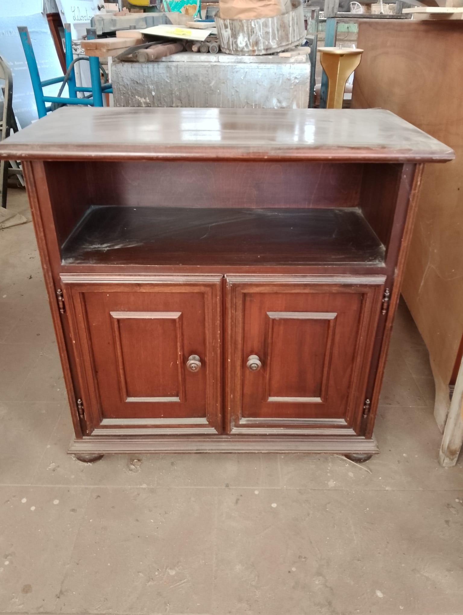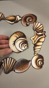 Scelto un vecchio porta tv in legno scuro con scansia e due sportellini sotto che avevamo già in magazzino, le uniche condizioni che ci hanno dato, sono stati i colori principali da utilizzare e il tema marinaro. In particolare hanno richiesto di poterci inserire qualche conchiglia dipinta.