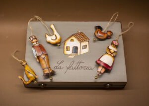 Il fulcro di questa collezione è una scatola in legno con dipinta sul suo coperchio, la tipica casa colonica marchigiana dal tetto ricoperto di tegole in cotto. Aprendo lo scrigno, compaiono i protagonisti del nostro racconto, dei pupazzi in stoffa dipinta, da appendere qua e là per la casa, o magari, adesso che sta per arrivare la Pasqua, inventarci un originale alberello. C’è il capofamiglia, il contadino dai grandi baffi, la camicia a scacchi ed il gilet e sua moglie intenta in qualche faccenda domestica, con il grembiule da cucina e il fazzolettone in testa per coprire i capelli. A loro si aggiungono gli animaletti tipici dell’aia: l’oca bianca dal lungo collo, la gallinella e l’immancabile gatto randagio.