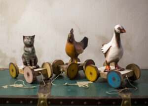 Le stesse bestioline vengono riproposte come vecchi giocattoli. In terracotta dipinta, oca, gatto e gallina sono posti su vecchie tavole di recupero munite di ruote e spago per il traino. Ovviamente il tutto ha solo scopo decorativo, nessun bambino potrà scorrazzare per casa con un’ochetta al seguito. La struttura è in realtà un semplice piedistallo.
