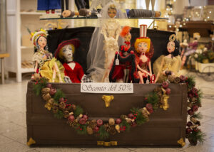 Dentro di esso comodamente sedute, troverete alcune delle bambole create all’interno del laboratorio, darvi sorridenti il benvenuto! Inevitabile essere poi attratti dal cartello attaccato davanti con su scritto “Sconto del 50%”.